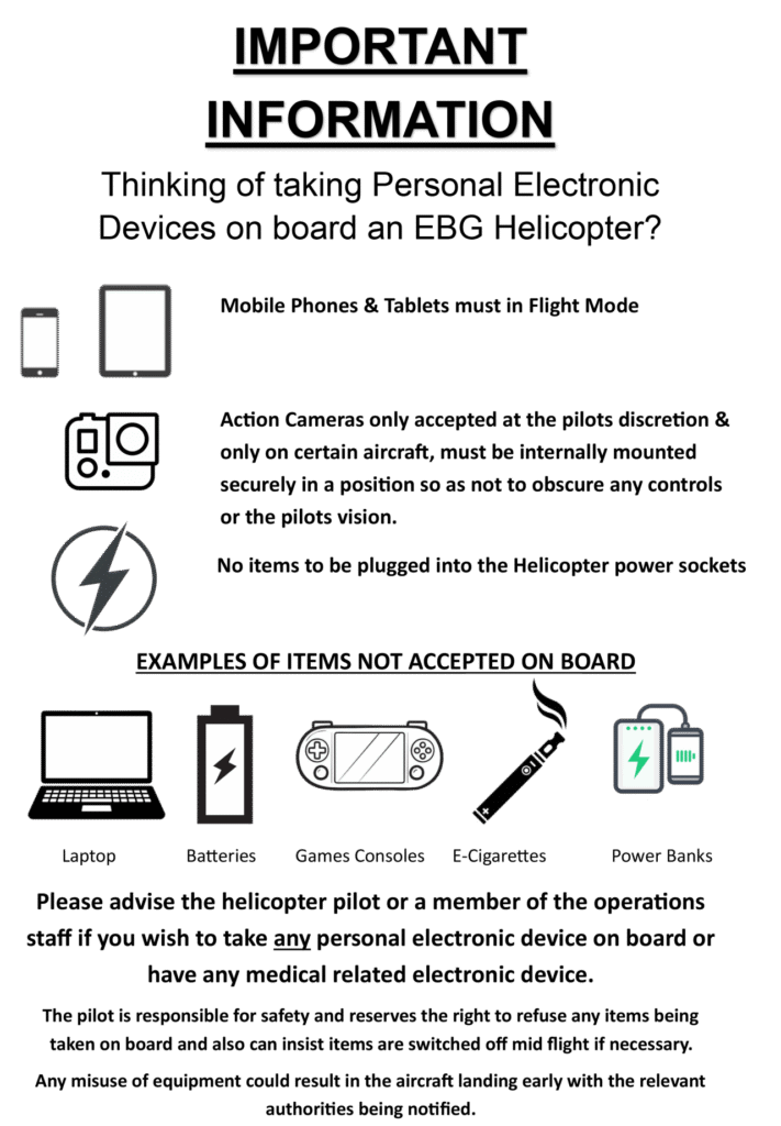 Minimum Age is 6 years for voucher flights. (By law Children from 2 years old must have their own seat when flying in a helicopter). The Carrier makes every effort to help Disabled Charterers – please contact the Carrier for more information.